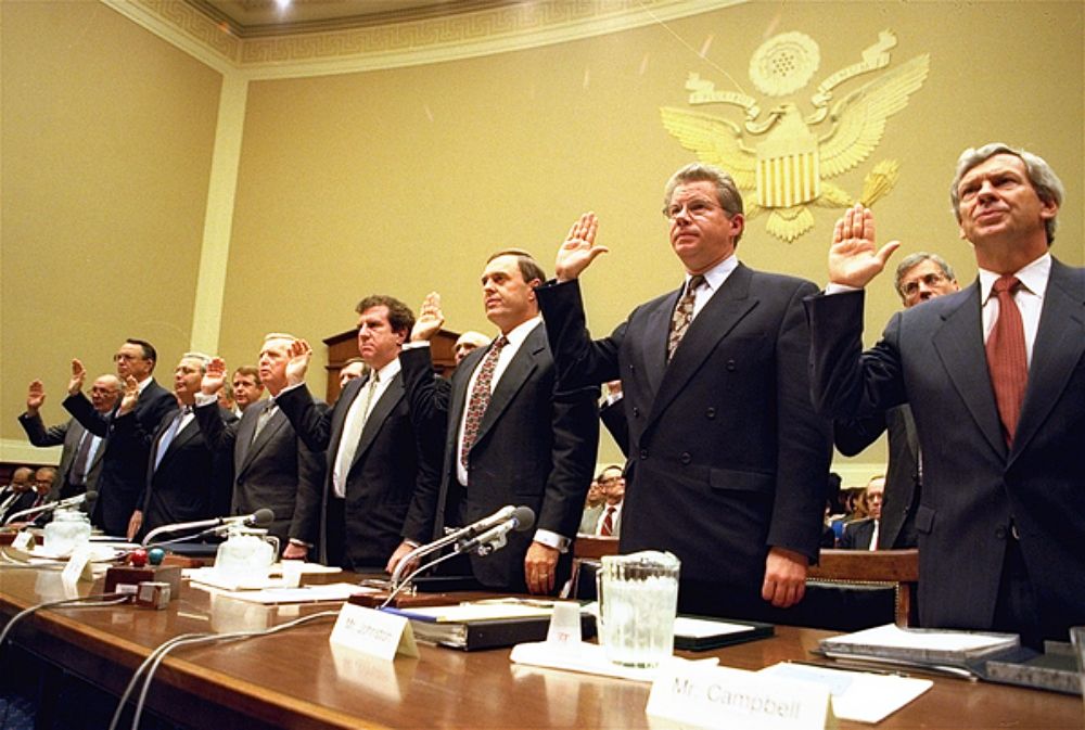 의원: 자, 니코틴의 중독성 여부에 대한 질문을 시작해 보죠. 먼저 한 줄로 쭉 답변해 주시기 바랍니다. 여러분 각자에게 니코틴이 중독성이 없다고 믿는지 묻겠습니다. 예 또는 아니오로 답해주십시오. 니코틴은 중독성이 없다고 믿으십니까?