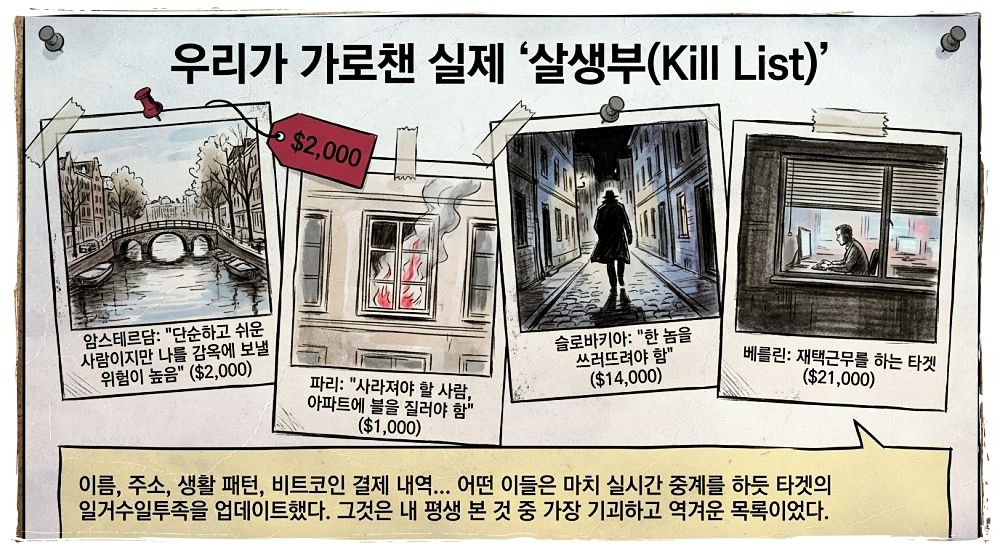 유럽 각지에서 수 천 달러에서부터 2만 달러에 달하는 주문까지 수두룩했다. 타겟에 대한 정보와 동선 그리고 살해 이유에까지 그야말로 신청자(?)들의 가지각색 사연(?)으로 가득했다.