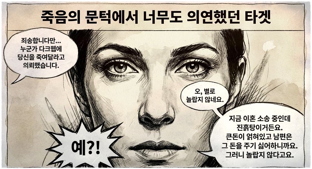 "먼저, 죄송합니다. 이런 말씀을 드리기가 참 쉽지 않네요.. 누군가가.. 다크웹 청부살인 사이트에다 당신과 관련된 정보를 올렸다는 정보를 입수하게 돼서요."
